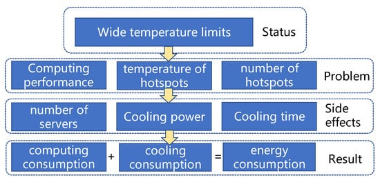 Much research has been performed with the goal of saving energy while reducing hotspots. However, existing studies focus on energy saving with few hot spots, ignoring how hot spots are measured and how soon they can be eliminated [5]. These two overlooked points affect both the energy consumption and the number of hotspots, as shown in Figure 2. At this stage, the main problems in data centers are due to broad temperature constraints. The end result is a waste of energy for both computing and cooling. This is the problem that the approach of this paper aims to solve. Cooling a hotspot when it has been in place for some time requires more power and takes a longer time than cooling a hotspot when it is just becoming hot, resulting in more energy consumption. See the examples in Section 4.2 for detailed descriptions. Furthermore, setting the limit temperature for hotspots at the maximum value to guarantee safety only theoretically guarantees stable operation of the data center, which has little to no ability to cope with unexpected situations.