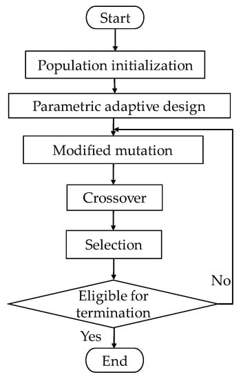 Following the algorithmic flow of the differential evolution algorithm (Algorithm 1), a crossover operation is performed after the mutation. The crossover is executed based on Equation (23), where the values of the crossed individuals are randomly selected from the corresponding values of the variant individuals or the corresponding original individuals. The generated random number is compared with the crossover probability to decide whether the crossover operation is executed or not, and the crossover individuals are thus obtained, as shown in Equation (23):