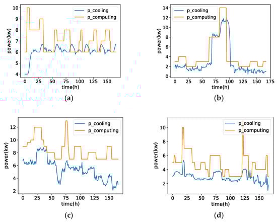 Figure 6 shows the power control approach for different load cases. It shows the control method for computing power consumption and cooling power consumption for a time density of 1 h during a week. It can be noticed that as the load increases, the computational power consumption increases, and thus the heat caused by the computation increases, creating a tendency for the rack exit temperature to increase. As the outlet temperature increases, the cooling equipment requires an increase in cooling power consumption as a means of reducing the rack temperature and keeping it under the limit at all times. In more detail, from the comparison of the four cases we can also find that the cooling power is lower than the computing power when the task demand is less than 50%, and the cooling power response is slower due to the low computing power at this time, as in Figure 6a,d.