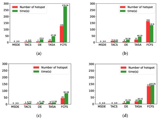 Comparison of the number of hotspots and hotspot elimination time results: (a) case 1, (b) case 2, (c) case 3, (d) case 4.