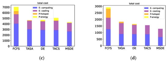 In order to better compare the energy consumption between the methods, the results of the runs were visualized for the four different load cases, as shown in Figure 8. As we can see, blue and purple represent energy consumption due to computing and cooling, while yellow and orange represent penalties due to poor system performance. When compared according to the evaluation method proposed in the comparison method text, the average cost saving of this work compared with the comparison method is 378 kWh, 883 kWh, 462 kWh, and 233 kWh for each of the four load conditions, with an average cost saving percentage of 7.96%, 11.1%, 11.3%, and 12.9%, respectively. We can see that the energy cost of our method is slightly lower than other methods, but the penalty cost is extremely low so the overall cost is the lowest. Even evaluated according to the costing method proposed in this paper, this work can have an average cost saving of 2000 kWh for each of the four load conditions.