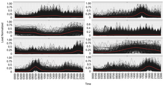 K-means analysis results for all the homes, incorporating energy data from all homes and identifying energy patterns for the whole study. The black lines represent the data objects that were assigned to that cluster and the red lines represent the energy profile for that cluster.