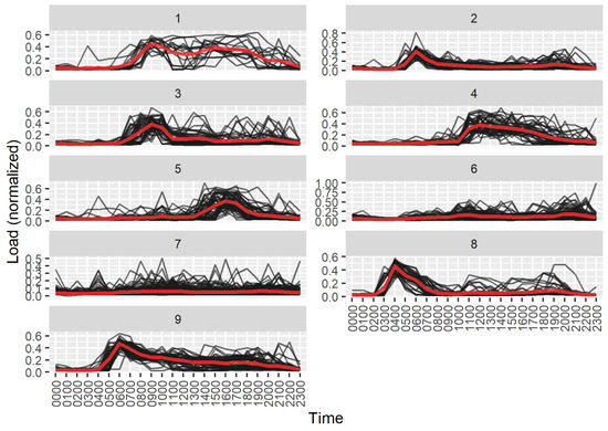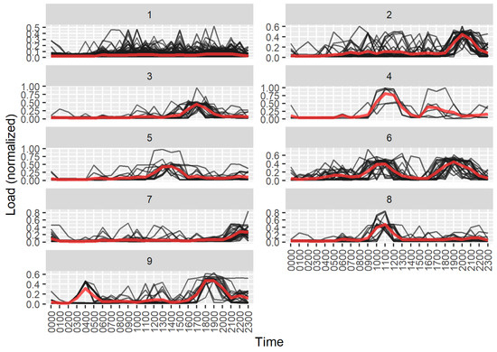 A visual inspection of these clusters shows the temporal variability of energy consumption for the household. The red line represents the average daily consumption profile for that cluster. The comparison of the peaks across all the clusters outlines the variability of consumption for the household in question. The time of day in which the peak occurs is different between all nine clusters. Furthermore, the shape and magnitude of the peaks offer an insight into the flexibility of the occupants’ routines.