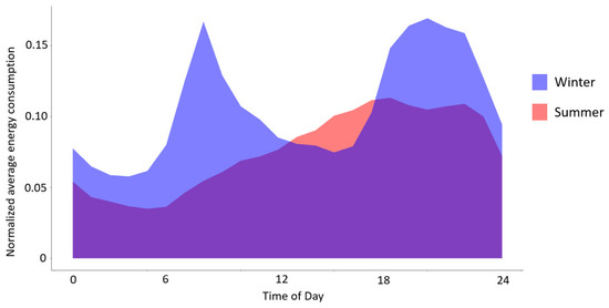 Comparison of the average energy consumption in the winter and summer seasons can outline the different heating and cooling practices of the occupants. The analysis demonstrated the distinct changes in the routines and the way occupants consume energy during these two time periods. Figure 7 outlines the changes to the shape of the daily consumption profile, with the magnitude and characteristics of each peak being variable. The figure highlights the significant change in consumption between the winter and summer season, with winter heating showing a much higher daily consumption rate. For this study, the winter profile followed a dual-peak profile with significant sharp peaks occurring in the morning and late afternoon. Alternatively, the summer season showed a different shape with no morning peak but a broad medium peak in the afternoon. The magnitude of the afternoon peaks is substantially different, with the summer afternoon peak being approximately 33% lower than the winter afternoon peak. This relates to the way the occupants live differently when exposed to hot and cold seasons and how they consume energy to achieve thermal comfort within the home, which is often linked to the performance of the thermal envelope of the home.