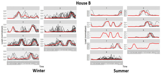 House B winter and summer K-mean results. The black lines represent the data objects that were assigned to that cluster and the red lines represent the energy profile for that cluster.