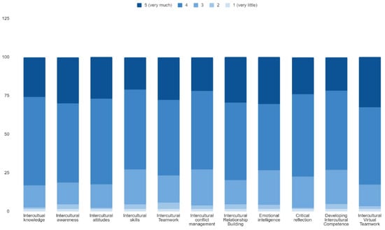 According to the perception of the majority of students (more than 70%), the project developed all 11 dimensions of the adapted version of the EMIC Intercultural Competence model (2015) to a high extent (4 or 5 on a scale of 1–5).