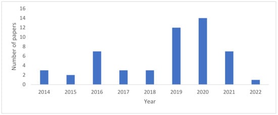 Applying the criteria described in Table 1 to the 123 identified records, 52 papers were considered to be relevant for the objectives of the review (Figure 1). A critical observation of the development of papers shows that the number of papers published on CIS has increased from 2014 to 2020. It reached a maximum of 14 in 2020 (Figure 1). However, a declining trend was observed from 2020 to 2022. This can limit the amount of information generated on CIS available for farm-level decision-making