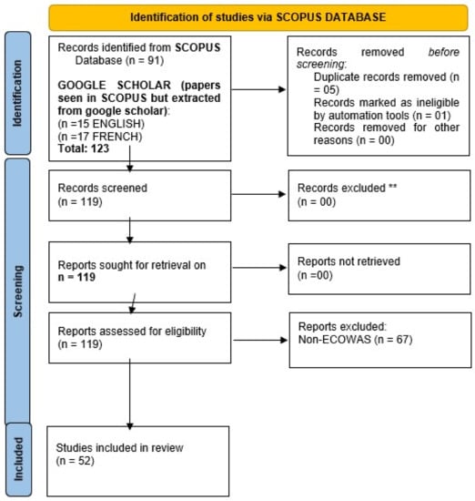 To answer our research questions on demand, characteristics, and drivers, the strategy was designed to capture relevant papers from the SCOPUS database. To do so, some keywords derived from the research questions were defined. SCOPUS and Google Scholar were targeted as the most complete bibliographic databases that cover scholarly literature from almost any discipline. Three different combinations of keywords were used in the search strategy. The search process used the following keywords in the title: (“Climate services” AND demand AND agriculture) OR (“Weather forecast” AND demand AND agriculture) OR (“Climate information” AND demand AND agriculture). However, with these keywords, the results were not fruitful. The final formula used to extract the records was TITLE (“Climate information” OR “Climate service” OR “weather forecast”) AND (agriculture) AND SUBJAREA (busi OR deci OR econ OR soci). With this strategy, 123 records were identified from SCOPUS and Google Scholar databases. For reporting, the PRISMA framework, which comprises mainly four stages including identification, screening, eligibility, and included papers [], was used. We used criteria (described in Table 1) to select the relevant papers for analysis among the 123 papers identified (Supplementary Materials).