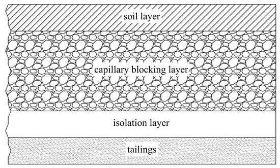 For this reason, experts and scholars have oriented their research toward alkaline-mixed isolation materials [7] and hardpan isolation layers [8] to prevent tailing oxidation and diffusion; moreover, a study focused on various reclamation methods [9], and the parameters of the surface coverage profile of tailings ponds [10] were also investigated to solve the problem and to prevent tailings from escaping, reducing surface water infiltration and weathering and acidification of tailings. The surface coverage structure is shown in Figure 1, whereby the isolation layer is constructed for the purposes of impermeability and the adsorption of heavy metal ions. In many studies, sodium-based bentonite has been an important modified material for the isolation and adsorption of Pb(II) ions. Adding bentonite can adsorb and fix Pb(II) ions [11,12] and can reduce the permeability of the isolation soil [13], lending the isolation soil good waterproofing and pollution interception performance. However, the addition of bentonite leads to the improvement of the compressive properties of loam or sandy soil [14,15,16]. Under lower normal stress, isolation soil made of soil–bentonite undergoes greater settlement compared to soil without the addition, resulting in shearing. Cracks caused by shear damage lead to a decline in the water resistance of the surface coverage structure and the leakage of heavy metal ions. This kind of damage is largely shear damage [17]. Therefore, it is necessary to study the shear strength properties of soil–bentonite materials to prevent geological hazards and environmental risks caused by isolation soil damage. To ensure the stable operation of the isolation layer, this study took the isolation layer in the surface coverage structure of the heavy metal tailings pond as the research object and studied the influence of different conditions and Pb(II) ion concentrations on the shear strength, as well as parameters of the isolation soil under low normal stress and its changing laws.