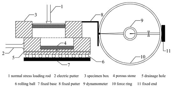 The surface coverage structure is located on the top of the tailings pond and the isolation layer is buried at a very shallow depth beneath surface; therefore, the lateral pressure to which it is subjected is basically negligible, and a direct shear test is appropriate. The surface coverage structure is designed with a capillary blocking layer, one of the functions of which is to perform drainage, keeping the isolation layer from becoming saturated; therefore, it was decided that the direct shear test model would be undrained quick cut. In the direct shear test experiment, several samples of the same soil were subjected to different vertical pressures, the horizontal shear force was applied directly along the fixed shear plane to obtain the shear stress at failure, and then the shear resistance of the soil was determined according to Coulomb’s law.