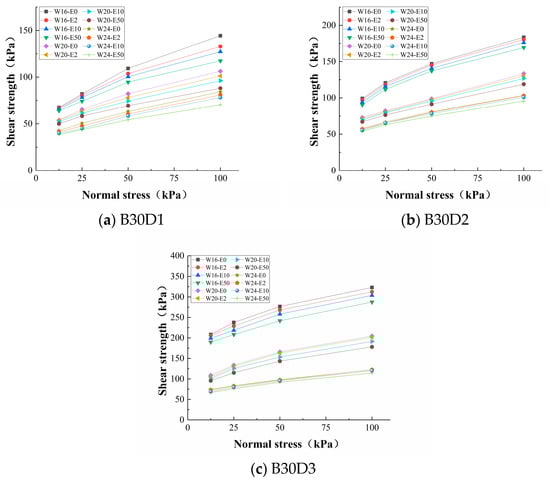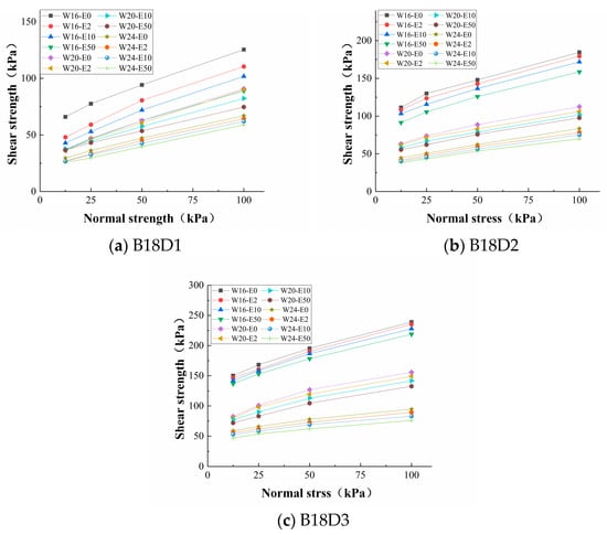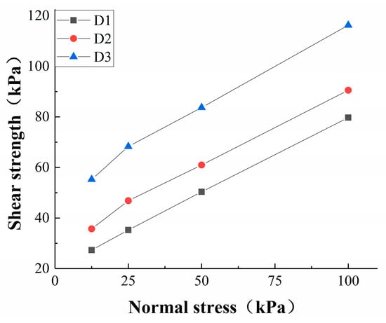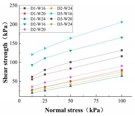 In the experimental group of dry bulk density and water content, the Mohr–Coulomb curve was not a straight line but indicated lower shear strength under lower stress, as can be seen for D3-B16, D3-B20, D2-B16, and D1-B16. With increasing normal stress, the shear strength showed a nonlinear increase and the internal friction angle continued to decrease to the internal friction angle in the high-water-content experimental group, whereby the same phenomenon was described by Xiao et al. [23]. With increasing normal stress, the growth rate of the strength gradually decreased to a stable state. Under the normal stress of 0~50 kPa, the shear strength of the soil presented a nonlinear increase, and after reaching 50 kPa, it showed a stable linear increase.