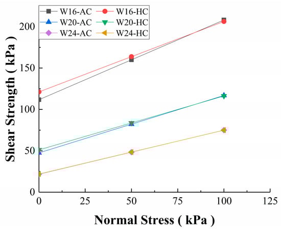 According to the research conclusions of Huang et al. [22], when the normal stress is higher than 100 kPa, c and φ are greatly affected by water content. In this study, in the experimental group with 16% water content under the loading of different normal stresses in the range of 12.5~100 kPa, the φ value gradually decreased with increasing normal stress until a relatively stable value coinciding with the value of the linear Mohr–Coulomb curve was exhibited in the high stress stage; this same phenomenon was reported in the research by Xiao et al. Although the AC’s parameters have a certain deviation compared with the linear parameters, they reflect the specimen’s the actual value, so this paper discusses the actual value of c and φ within the range of 12.5~100 kPa.