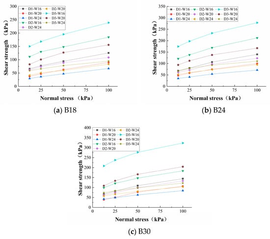When treated with the Pb(II) ion solution, the shear strength of the B24 experimental group decreased the most; the shear strength of the B18 experimental group decreased by 0.5~12.7 kPa, the B24 group decreased by 3.9~30.3 kPa, and the B30 group decreased by 2.2~22.4 kPa. The shear strength of the B18 experimental group showed an increasing trend, except that the D1W16 and D2W16 experimental groups showed a slight decrease after erosion compared with the experimental group without the addition of bentonite. The shear strength of the B18 groups treated with Pb(II) ions under a normal stress of 100 kPa increased by 4~20.6 kPa compared with the experimental group of B0. B24 increased by 2.3~38.4 kPa, and B30 increased by up to 73.5 kPa compared with B0. The above increments all increased with increasing dry bulk density and decreasing water content, which is consistent with the phenomenon previously described. The decrease in the shear strength of bentonite caused by the influence of Pb(II) ions tended to be stable when the addition of bentonite reached 24%, indicating that the maximum amount of bentonite is 24%, after which the effect of the Pb(II) ions on the shear strength of the specimen decreased and the increase in shear strength began to decay. Comparing groups with the same dry bulk density in Figure 7 and Figure 10, it can be seen from the degree of decrease in shear strength with Pb(II) pollution had a greater effect on specimens with lower water content and higher bulk density.