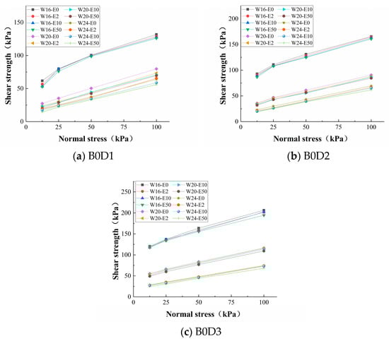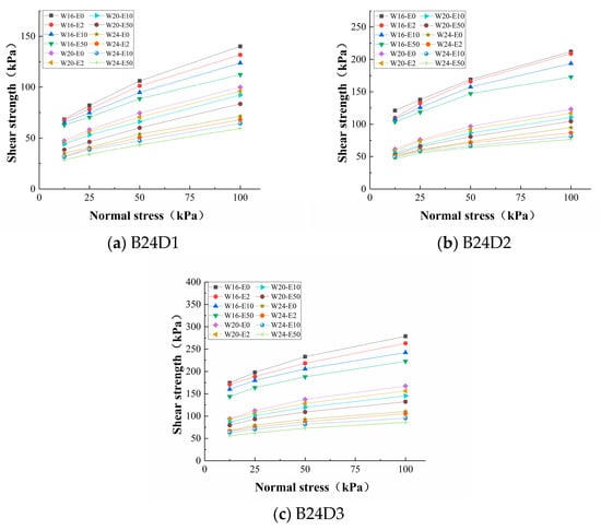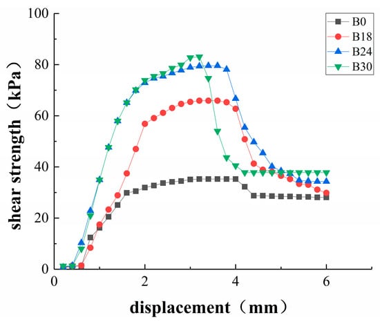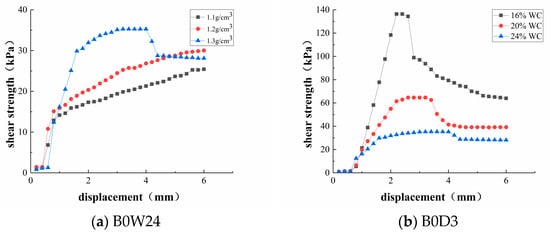 Figure 11a shows the stress–strain curve of each specimen in the B0W24 group when the normal stress is 25 kPa. It can be seen that with increasing dry bulk density, the peak value of the specimen increased and the shear modulus was 16.6, 24.2, and 28.6 kPa/mm. With a dry bulk density of 1.1 g/cm3 and 1.2 g/cm3, the peak strength of the specimens increased with increasing displacement and no fracture occurred within the limited range, so the residual strength cannot be read, while the residual strength of the specimen with a bulk density of 1.3 g/cm3 was 28.1 kPa. Figure 11b shows the stress–strain curves of specimens with different water contents in the B0D3 group under a normal stress of 25 kPa. It can be seen that with increasing water content, the brittleness of the specimens decreased and the ductility increased significantly, while the displacement of reaching peak strength increased with the water content from 2.2 mm at 16% water content to 2.6 mm at 20% water content and 3.2 mm at 24% water content. At the same time, the elastic modulus of the specimen decreased from 93.5 kPa/mm at 16% water content to 28.6 kPa/mm at 24% water content; the residual strength also decreased with increasing water content, with values of 63.99, 39.18, and 28.1 kPa, respectively. It can be seen that increasing the dry bulk density and decreasing water content could effectively result in an increased shear modulus and ductility in the soil, such that it has greater elasticity and can resist damage due to external forces, and the residual strength of the specimen could also be greatly improved after failure.