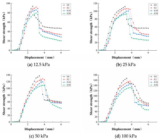 In addition to reducing the cohesion and internal friction angle of the specimen, Pb(II) ions also had a great impact on the stress–strain characteristics of the specimens. Figure 13 shows the stress–strain characteristics of the specimens under different degrees of lead ion contamination in the D3B24 group. From the graph, it can be clearly seen that Pb(II) contamination decreased the brittleness of the specimen, and the displacement reaching the peak value of shear strength was obviously moved backward, increasing by 0.2~0.4 mm. In addition, after the specimen reached its peak strength, the instantaneous attenuation of shear strength gradually decreased with increasing normal stress. Under the stress of 12.5 kPa, with increasing concentration of lead ion contamination, the shear strength of specimen decreased rapidly within 0.4 mm displacement, with change rates of 26.2%, 41.4%, 44.8%, and 53.1%, respectively. This phenomenon gradually decreased with increasing normal stress. The change rates of E0~E50 within 0.4 mm at 25 kPa were 40.1%, 24.3%, 37.0%, and 45.7%, the change rates at 50 kPa were 40.0%, 26.2%, 33.7%, and 28.1%, and the change rates at 100 kPa were 11.5%, 22.5%, 16.9%, and 13.5%. This phenomenon is related to the densification of the specimen caused by the normal stress in the former discussion presented in this research. With an increasing concentration of Pb(II) ion contamination, the residual stress also showed a decreasing trend that is similar to the law of peak strength. When the normal stress was 12.5 kPa, the residual strengths of E0~E50 were 29.6 kPa, 21.2 kPa, 17.9 kPa, and 12.9 kPa, and with increasing normal stress, the residual strength of each treated specimen increased. When the Pb(II) ion pollution was 0.2 mg/L, the residual strengths under 12.5~100 kPa were 21.2 kPa, 25.6 kPa, 36.5 kPa, and 41.5 kPa, respectively.