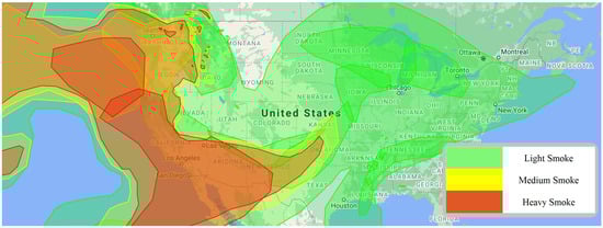 However, the negative impacts of massive wildfires are not restricted to the burned areas or the areas adjacent to wildfires. Depending on the weather conditions, the smoke from wildfires can spread far beyond the burned-out site of the fire. In September of 2020, for example, the smoke from dozens of wildfires in California and Oregon stretched clear across the United States and even reached parts of Mexico, Canada, and Europe, thus diminishing air quality, and creating numerous health concerns [16]. Figure 1 illustrates the smoke dispersion layers from the U.S. National Oceanic and Atmospheric Administration (NOAA) Hazard Mapping System (HMS) on 9 September 2020.