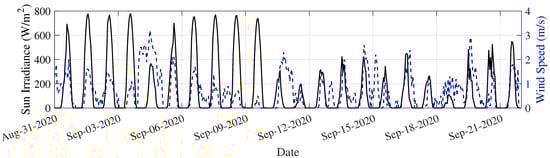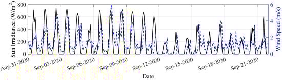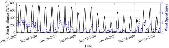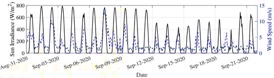 Solar irradiance (W/m2) and wind speed (m/s) during the first three weeks of September of 2020, in Puyallup, WA.