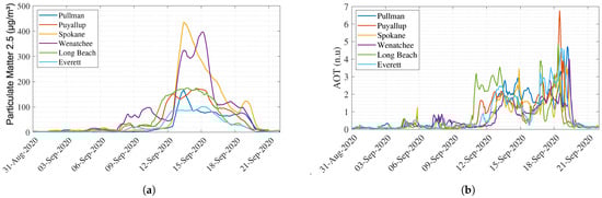 Figure 9b presents the AOT values, collected from the Modern-Era Retrospective analysis for Research and Applications, Version 2 (MERRA-2), available in [37]. It turned out that, after 11 September 2020, the AOT increased significantly in all analyzed locations in the state of Washington. The highest AOT levels were measured in Puyallup, which also experienced the highest sun irradiance variations, as previously shown in Figure 6.