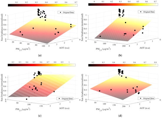 When looking at the overall relationship between AOT and normalized PV capacity, there is a generally linear relationship [25]. Therefore, a multiple regression analysis is proposed, considering both the AOT and the PM 2.5 to estimate the reduction in PV generation when wildfire smoke is present. The sun irradiance values between 11 a.m. and 1 p.m. are extracted from the assessment period in order to consider the impact on the peak PV capacity.