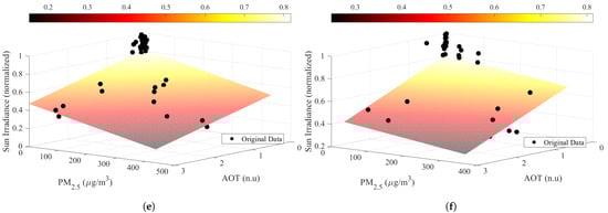 Multiple linear regression analysis between the solar irradiance, the AOT, and the PM 2.5 data during the 2020 wildfire season for the cities of (a) Everett, (b) Long Beach, (c) Pullman, (d) Puyallup, (e) Spokane, and (f) Wenatchee.