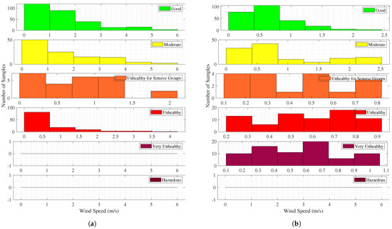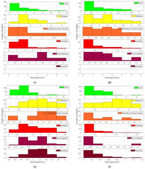 Among all analyzed locations, Everett and Pullman were the locations whose AQI values were predominantly good during the analyzed period. However, in Pullman, the average wind speed decreased by about 38% when comparing all the samples with a PM 2.5 AQI higher than 12 g/m3, and by 29.80% for the city of Everett. In Pullman, the average wind speed during good AQI conditions was 52% higher than the average wind speed during unhealthy for sensitive groups AQI conditions. The same behavior was observed for all analyzed locations. The wind speed histograms were split according to each PM 2.5 AQI category shown in Table 1. A total of 528 points were obtained for each location. Figure 13a–f present the wind sped histograms for Everett, Long Beach, Pullman, Puyallup, Spokane, and Wenatchee, respectively. The average wind speeds, in meters per second, for the analyzed period are presented in Table 10.