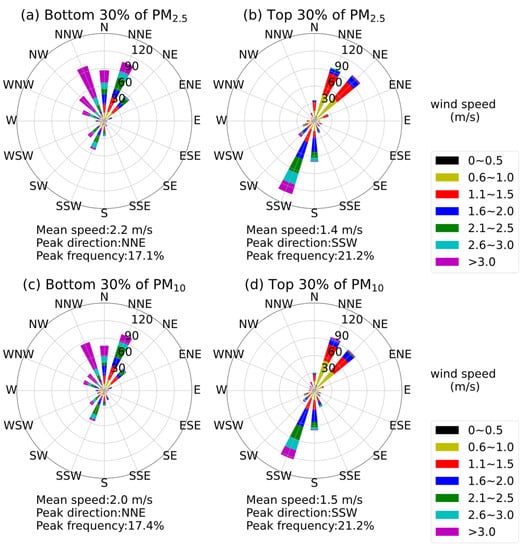 Notably, one intriguing feature is that when the prevailing wind changed from north-west (Type 2) to south-west or south-east (Type 1 and Type 4), the pollution scenario in Beijing was exacerbated (Figure 5). To further elucidate the impact of dominant wind directions on pollution scenarios in Beijing, the observations of near-surface winds at different air pollution levels are illustrated in Figure 6. The top 30% of the PM and O3 samples were characterized by south-westerly winds (Figure 6b,d,f). In contrast, the bottom 30% of the PM and O3 samples were consistently related to north-westerly and north-easterly winds (Figure 6a,c,e). As analysed above, this discrepancy may be related to the atmospheric transportation of air masses originating from regions with different air qualities.