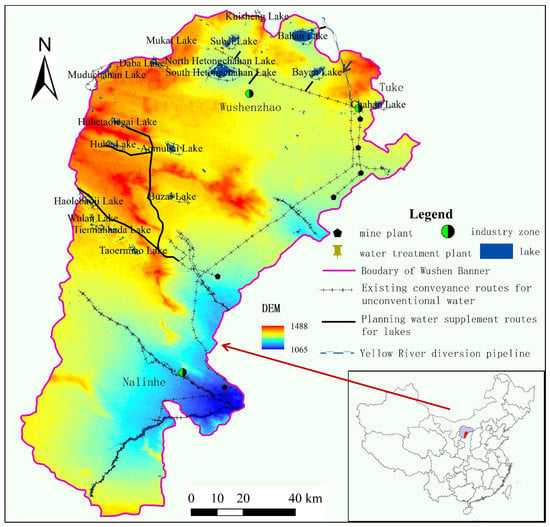 Northwest China is rich in coal resources but poor in surface water resources. With the exploitation of coal mines, a large amount of groundwater is released. If this amount of groundwater is not reasonably utilized, it will not only lead to environmental pollution [] or ecological accidents [], but also waste valuable water resources. Meanwhile, the water ecosystem is very sensitive to the water. With the recent intense human activities and climate change, the ecological functions are seriously degraded, especially for lakes in plateau and desert hinterlands. There needs to be a stable water source and reliable water supply and water quality to improve the ecological environment and its functions.
