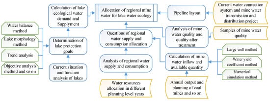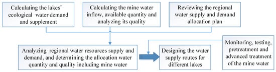 Firstly, three main aspects of the current situations are assessed, including calculating the lakes’ ecological water supplement; reviewing the regional water resources allocation plan according to the situation of current water supply (especially mine water) and its utilization; and calculating the mine water inflow and available quantity, and analyzing the water quality and quantity requirement of mine water for lake water ecological protection. Secondly, regional water resources supply and demand is analyzed, and the allocation plan of water resources including mine water is determined. Finally, using the existing water pipes, a new water supply routes for lakes’ water demand is designed. Thus the efficient utilization mode of mine water for lakes is proposed (see Figure 2). Figure 3 gives a more detailed idea and calculation methods.
