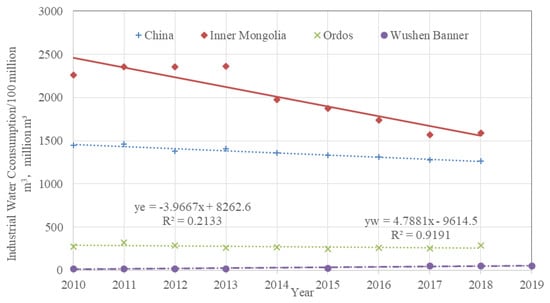 Trend of industrial water consumption of China, Inner Mongolia, Ordos, and Wushen Banner.