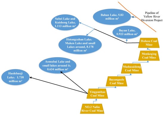 With the average value for many years, it is necessary to supply about 18.42 million m3 of water per year to maintain the basic water surface area of the important lakes in Wushen Banner. According to the actual investigation of the coal mine locations and the available water supply of the mine water in the year 2018 and 2019, priority should be given to the allocation of mine water for the lakes. Therefore, the water supplement path and the water quantity for each lake are proposed, as seen in Figure 5. It is the allocation plan for the lakes and also for the regional water demand and supply in the next few years.