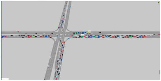 The Vissim oversaturation simulation software is shown in Figure 2. There are residual queues and overflows in the storage bay at the westbound, and the westbound is affected by the overflow at the east outlet. This paper will analyze the oversaturated traffic based on the simulation data in this scenario.