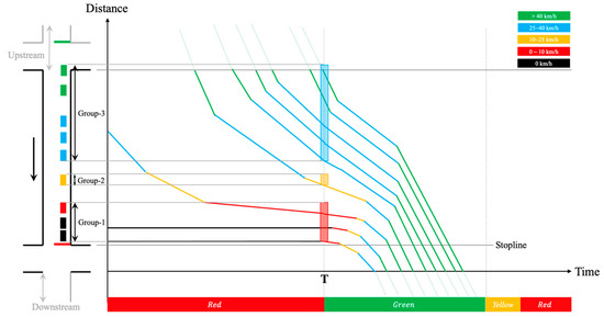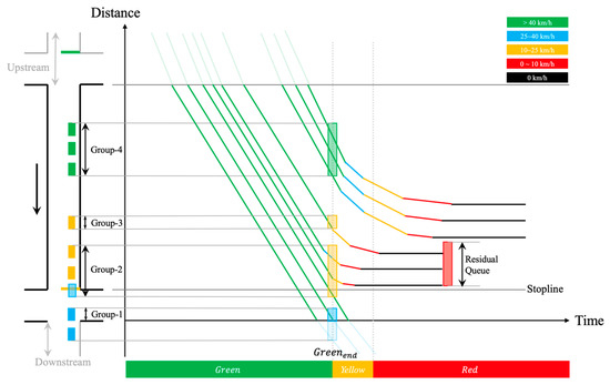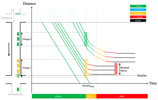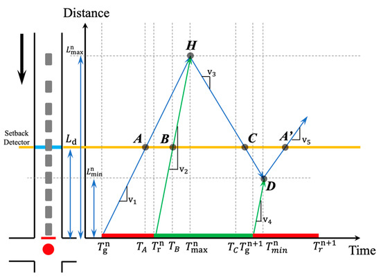 The existing TOSI calculation method relies on the high-resolution data obtained by the loop detector [21,22]. By setting a setback detector, the dissipation rate could be calculated according to the flow and density corresponding to the traffic state before and after . Then combined with the shockwave theory, TOSI could be calculated by estimating the residual queue length at point D in Figure 24. In this figure, the blue and green lines and their arrows represent the queuing growth and dissipation trends of vehicles, respectively. And the red dot on the left in Figure 24 indicates that the traffic signal light at the movement is red currently.