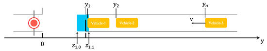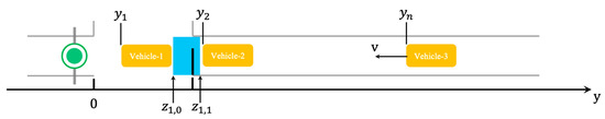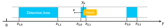 The schematic diagram of the vehicle passing through the virtual detection area is shown in Figure 4. The blue part is the detection area. Assuming that there are n vehicles in the detection area, their positions are denoted as the corresponding set . The position of a certain virtual detector and the length of its detection area can be denoted as and . Its detection area is defined as , and the complete set of detection areas is , the corresponding detector state is a Boolean variable set .