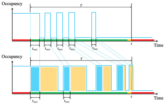 The number of activated and inactivated pulses (the blue line in Figure 9, activated is high and inactivate is low) in the statistical period are denoted as and , respectively, and the corresponding pulse response time series are denoted as and . The activated time a vehicle occupied when it passes through the detection area normally is denoted as (the blue shaded part in Figure 9), it is a dynamic value that depends on the speed of vehicle and the length of detection area. The detection period is from the beginning of green time to the end of yellow time ( and is the cycle length), and the span is . The value of SOSI is the sum of the time that exceeded the normally occupancy time (i.e., The sum of the yellow shaded part in Figure 9). The red, yellow, and green bar on the horizontal axis is a timing chart of the color change of the traffic signal lights.