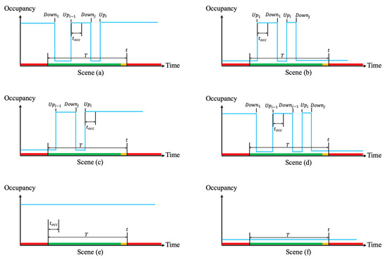 Under the detector layout described above, and according to the arrival and queuing conditions of the vehicle, the detector pulses in the statistical period can be divided into 6 scenes in Figure 10. The red, yellow, and green bar on the horizontal axis is a timing chart of the color change of the traffic signal lights, and the blue line is the value of the SOSI detector’s pulse (activated is high and inactivate is low). And the corresponding SOSI calculation methods are as follows.