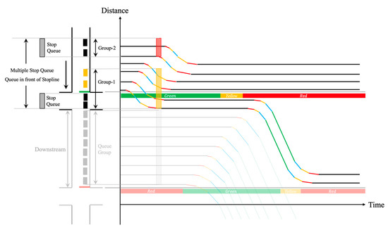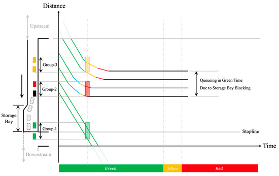 When a subsequently arriving vehicle on a movement is blocked outside the storage bay by vehicles overflowing from an adjacent movement, even if in the green time, there will be a growth queue in the upstream of the storage bay. As shown in Figure 11. In this figure, different color bars represent different vehicle formation groups, and the line is the trajectory of the vehicle, the darker the color, the slower the vehicle (Figure 12 is the same as Figure 11).
