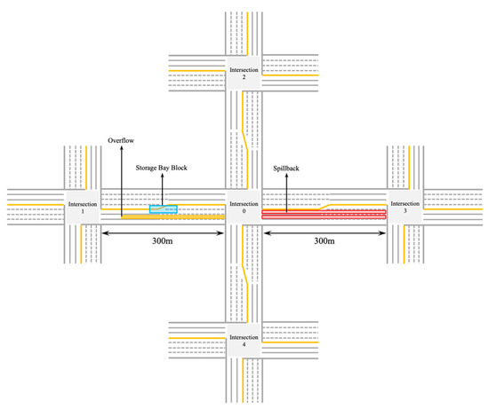 As mentioned above, occasionally, when the inputs from the upstream exceed the dissipative capacity of a certain movement, a temporary oversaturation will occur, which will dissipate by itself in the next cycle. However, in this case, if the queued vehicles overflow out of the storage bay, in addition to the hidden danger of increased oversaturation in the movement, it may also block the storage bay, and cause phase starvation in the adjacent movement, then the degree of oversaturation will increase, even spread to other movements. Therefore, in addition to the overflow and spillback, the storage bay blocking is also an important reason for the loading, aggravation, and spread of oversaturation.
