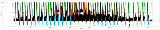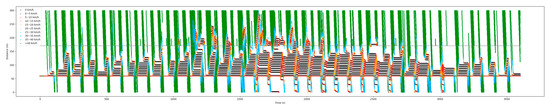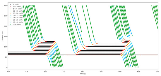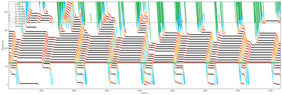 Figure 17 is the space–time diagram during the complete simulation. It reflects the trajectory of the vehicle in the movement, such as in Figure 14, but it is during the complete Vissim simulation. The darker the color and the denser the trajectories in this figure, the more serious the traffic congestion is.
