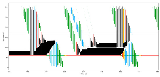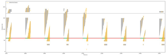 According to the analysis method of the causes of oversaturation in Section 2.5.2, the moment when there is an abnormal stop queue is represented by a yellow vertical line; otherwise, it is represented by a gray vertical line. The horizontal gray line (y is about 170) is the position of storage bay, and the horizontal colorful line (y is about 60 m, the position of stop line) represents the switching of the color of the signal light. When an abnormal queue occurs, if the abnormal conditions are determined to be the same at the next moment, it will be represented by a gray vertical line. That is, when determines that the abnormal stop queue has changed compared with the time , it is highlighted with a yellow line. It can be seen from Figure 23 that no matter whether the overflow comes from the downstream or the storage bay, it can be effectively identified, which is in line with expectations.
