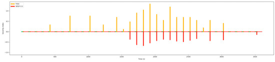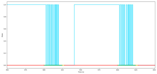 Figure 16 shows the corresponding pulses of the detector of Figure 14. The red, yellow, and green bar on the horizontal axis is a timing chart of the color change of the traffic signal lights. The position of the virtual detector is near the upstream of the stop line (about y = 61 m in Figure 14). The blue line in Figure 16 is the value of detector’s pulse. When the value of pulse is 1, it means that the detector is activated; 0 is inactivated on the contrary. SOSI can be calculated with the aid of this detector which accurately reflects the situation when the vehicle leaves the stop line during the green time.