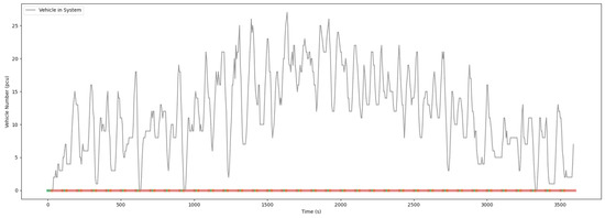 In the simulation, the green time for straight west at Intersection 0 is 25 s, and the saturated headway is 2.5 s. It can be calculated that when vehicles; there might be too many vehicles in this movement. And the change diagram of the number of vehicles in movement is shown in Figure 20.