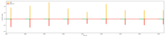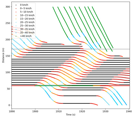 The main difference between the two methods is that in the case of downstream intersection spillback (SOSI > 0), if the estimated residual queue exceeds the setback detector’s position and occurs in multiple queues (TOSI > 1), the traditional method cannot obtain a more accurate residual queuing. In this paper, based on the data of multi-objective vehicles, the position and speed of each vehicle can be accurately known, and the vehicle formation can be obtained according to its position to obtain a more accurate residual queue length. Therefore, the calculated TOSI can more accurately reflect the degree of oversaturation in the temporal dimension. For example, at 1925 s of the simulation, the trajectory space-time diagram corresponding to the traffic state is shown in Figure 26. The TOSI calculated by the method in this paper was 1.34, while the value calculated by the traditional method was 1.06, as shown in Figure 25 where time is 1925. It can be seen from the time–space diagram that using multi-objective data to form vehicles to calculate TOSI can more accurately reflect the degree of oversaturation.