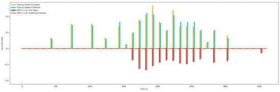 In Figure 25, it can be seen from the comparison results that the TOSI calculation method based on the vehicle formation proposed in this paper is relatively close to the results obtained by the traditional TOSI calculation method, which relies on a setback detector. The evolution trend of the oversaturation state reflected is the same. This further demonstrates the feasibility of using vehicle formations for TOSI calculations when multi-objective data are available.
