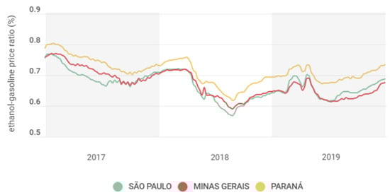 The historical series of fuel prices at distribution and retail markets (for instance, gasoline C, E100, diesel) segregated by state and city, both weekly and monthly, is available on the site of the Brazilian National Petroleum Agency [59]. This study uses the average weekly price of the state for gasoline C and E100 to calculate the weekly ethanol–gasoline price ratio (WEGPR) from January 2017 to December 2019 (157 weeks) in Brazilian reals (BRL) for the states of São Paulo, Minas Gerais, and Paraná (Figure 2 and Table S1). This time range was chosen because it was after the implementation of Petrobras’ fossil fuel import price parity policy and before the COVID-19 outbreak.