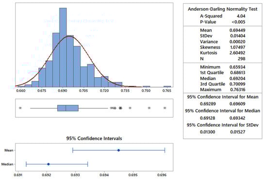 The calculated VFER median based on the NBR 7024 standard city cycle (VFERcity) was 0.688 (95% confidence interval (CI): 0.6857–0.6899) for the evaluated sample of 298 vehicles (Figure 3). The VFER median based on the highway cycle (VFERhighway) was 0.692 (95% CI: 0.6912–0.6934) (Figure 4). Despite being statistically different, the difference between the medians was only 0.004.