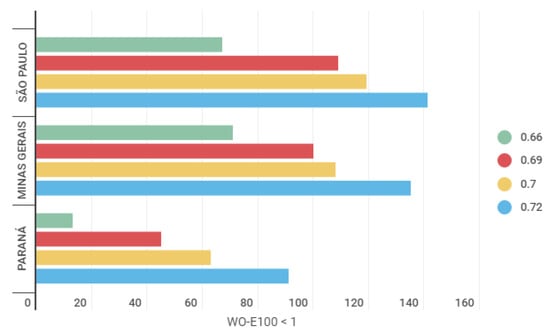 WO–E100 analysis shows a huge difference within the states for the evaluated lower and upper limits, 0.66 and 0.72, respectively (Figure 5). On the basis of only the price-sensitive customer behavior, a VFER of 0.66 creates the opportunity for the customer to fill up the car with E100 in 42.7% of the evaluated weeks in São Paulo. On the other hand, a VFER of 0.72 create the opportunity for the customer to buy E100 in 89.8% of the evaluated weeks in the same state. This is more than twice as many opportunities as those for the vehicle at the lower extreme, and 14% more opportunities to refuel it with E100 when compared with the 0.7 threshold. This result corroborates with that of Pacini et al. [54], who discusses how the 2% difference on the VFER heavily impacts the overall fuel competition.