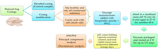 As a useful tool to interpret large datasets by forming fewer composite variables, principal component analysis (PCA) has been widely applied to analyze the volatile compounds of Harbin red sausages smoked with different woodchips [10], quality of cooked sausages with different types of casings [11], volatile organic compounds of Portuguese Painho de Porco Preto fermented sausages [12], texture profile of sausage added of pea protein isolate [13], and so on. Discriminant analysis (DA) is also a useful tool to determine possible categorical dependent variables based on the selected variables [14,15]. However, scarce information has been reported on the effects of hesperidin on the quality and microbial attributes of sausages stuffed in modified casings treated with different concentrations of surfactant solution and lactic acid. The innovative points of the current study are as follows: