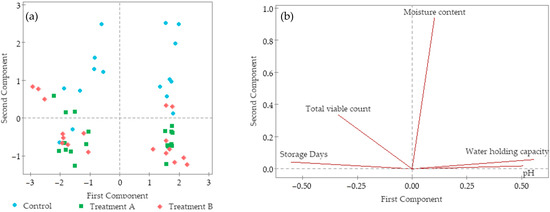 Moisture content, water-holding capacity, and pH were located on the opposite side of storage days and total viable count, indicating a negative correlation. It is well-known that the lower pH and moisture content will hinder the growth of microorganisms, leading to the lower value of TVC.