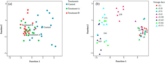 The distribution of the sausages in the coordinate system defined by the two discriminant functions used to differentiate among sausages with different treatments (a) and storage days (b).