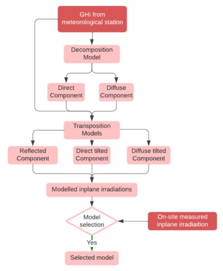Venues selected for the analysis has different orientation and tilt angle as summarized in Table 2. Due to differences in orientation and tilt angle incident irradiation on module surfaces varies for each installation [35]. In-plane irradiation measurements are not present for the systems analyzed therefore in-plane irradiation is modelled by using global horizontal irradiation (GHI) data acquired from the government owned meteorological station located within 6 km. Modelled irradiation data is further compared with a recently installed on-site meteorological station data available from June 2021 until April 2022 and applicability of the data from the government-owned meteorological station is tested. A brief description of the pathway for modelling in-plane irradiation by using GHI data is summarized in Figure 1 below [36].